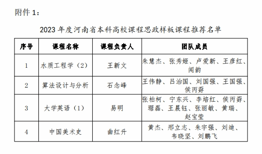 根据《河南省教育厅关于开展本科高校课程思政项目建设的通知》(教办高[2023]350号)文件要求,经个人申报、院部推荐、专家评审等环节,决定推荐“水质工程学(2)”等4门课程申报2023年度河南省本科高校课程思政样板课程,推荐“基础化学课程群课程思政特