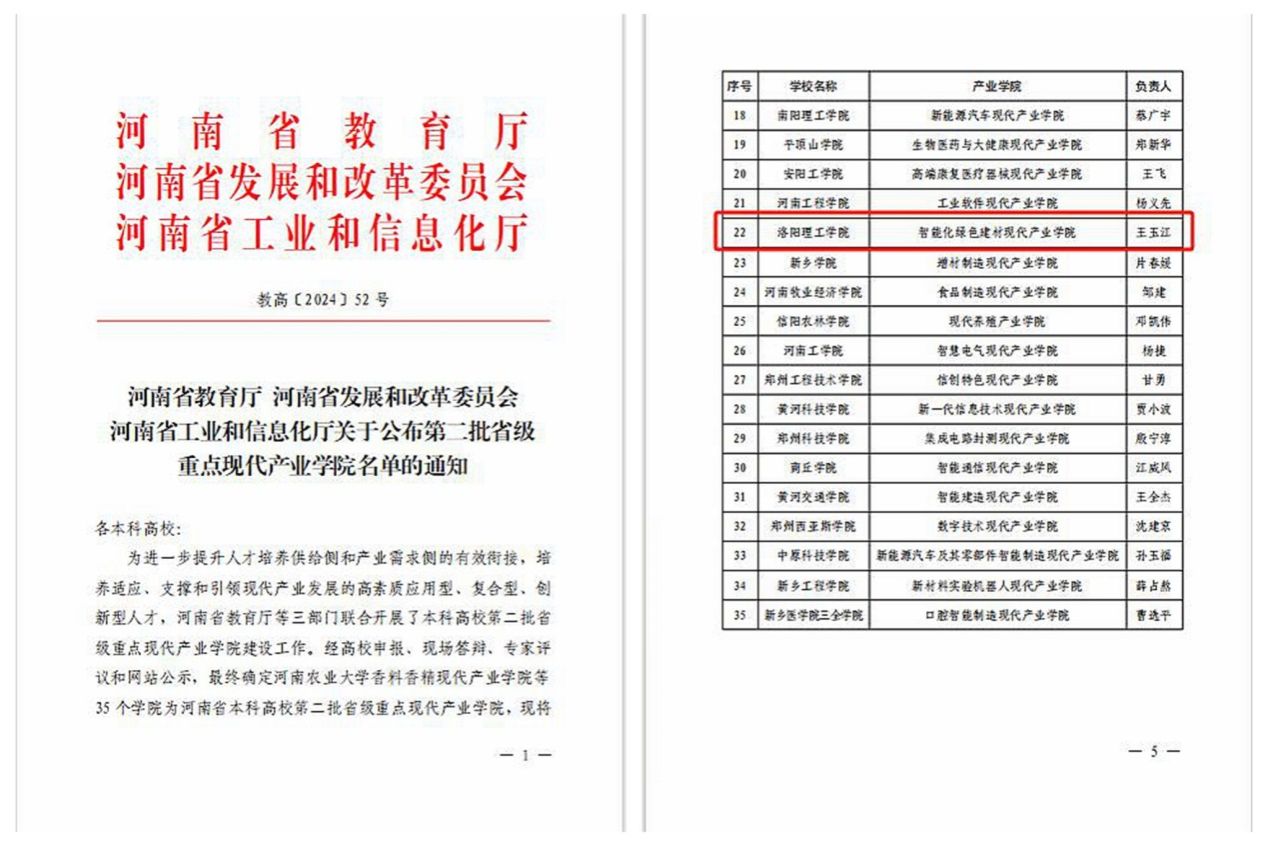 获批文件及名单(部分)近日,河南省教育厅、河南省发展和改革委员会、河南省工业和信息化厅印发《关于公布第二批省级重点现代产业美高梅娱乐场 名单的通知》(教高[2024]52号), 由美高梅娱乐场 材料科学与工程美高梅娱乐场 牵头申报的“智能化绿色建材现代产业美高梅娱乐场 ”获批第二批省级重点