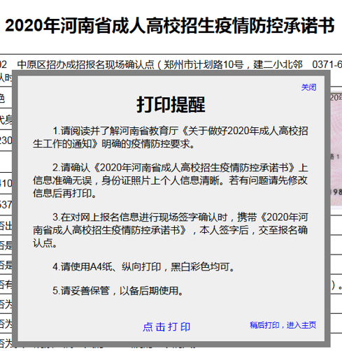 八、核对信息并打印承诺书(现场确认需要携带疫情防控承诺书)