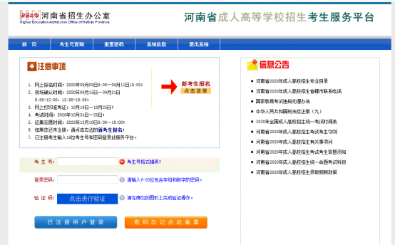 三、进入河南省成人高等美高梅娱乐场 招生考试服务平台(下图页面),点击红色箭头 “新考生报名”