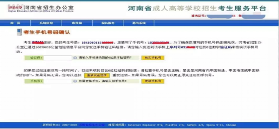 六、考生所填手机号会收到河南省招生办公室发送的确认短信,考生需输入收到的验证码进行手机号码验证,一个手机号码只能注册一次