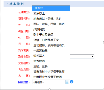 4、照顾对象符合照顾条件的一定要选择对应项,【按年龄、按三区三县、免考等】