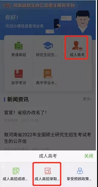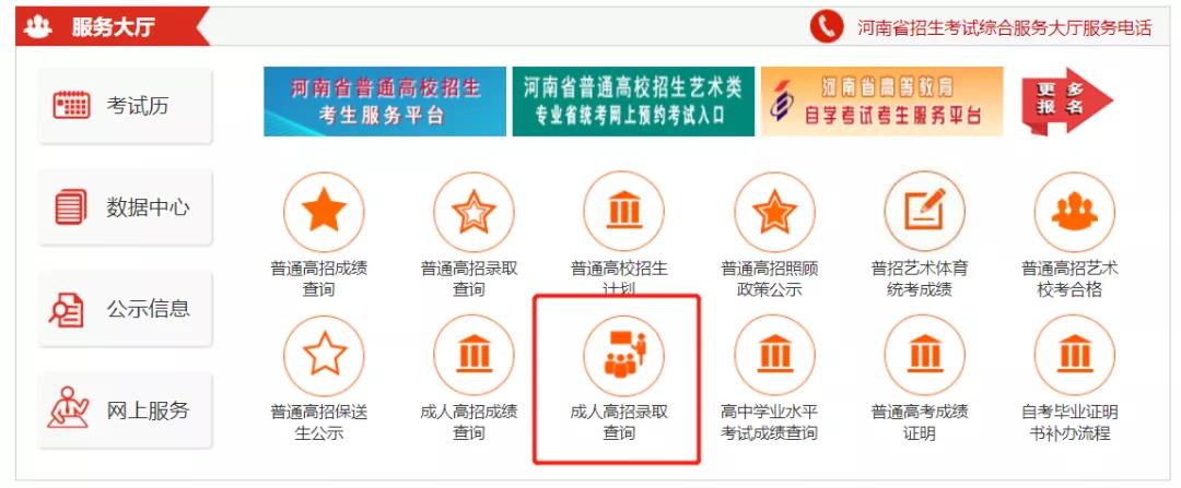 1、通过河南省招生办公室官网->服务大厅->成人高招录取查询