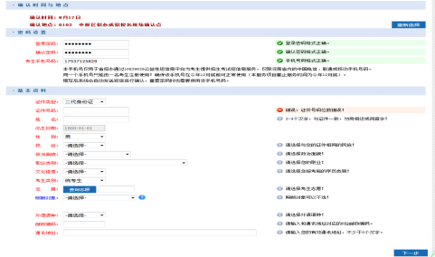 五、信息录入:选择确认时间与地点(考生按照自己的时间和距离选择具体确认时间和现场确认地点,列表中的时间和地点均可选择)、密码设置、考生基本资料等信息。(异地报考同学现场确认时,需要提供借考地居住证,没有居住证可回户籍所在地进行报考)