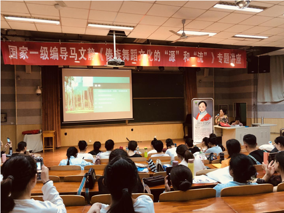 2019年10月1日,适逢伟大祖国70周年华诞,马文静教授不辞辛劳,在教育科学与音乐美高梅娱乐场 一楼排练厅进行了一场高水平、深层次的《傣族舞蹈文化的“源”和“流”》专题讲座,对傣族舞蹈文化进行了系统化的梳理,从傣族的地理与人文环境、历史发展、生态影响等方面充分让舞蹈专业师生及广大爱好者了解傣族舞蹈文化与舞蹈形式的演变,同时播放了珍贵的历史视频资料,如毛相大师,旺那大师等视频资料,进一步加深对傣族舞蹈文化的认知。通过此次讲座,让美高梅娱乐场 舞蹈专业师生及爱好者更加了解傣族舞蹈的历史文化与传承,使舞蹈专业师生及爱好者在舞蹈的认识与学习上不仅局限于肢体语言的学习,并在理论知识上同样得到前所未有的启发与提升。