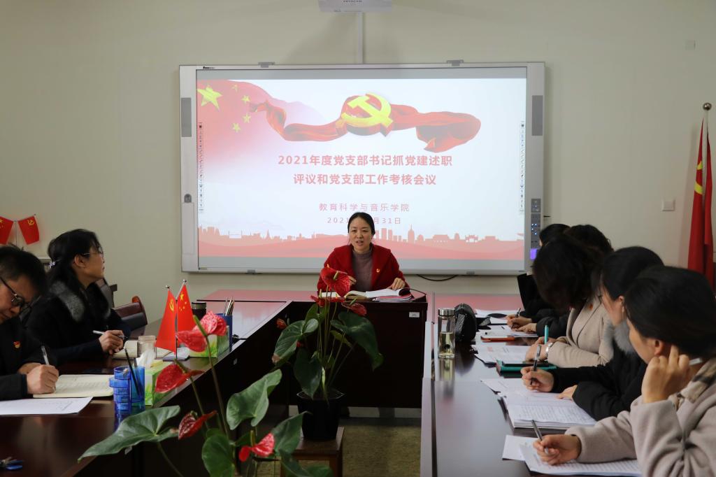 为深入学习贯彻习近平新时代中国特色社会主义思想,全面贯彻党的十九大和十九届二中、三中、四中、五中、六中全会精神, 进一步落实管党治党政治责任,不断强化“答卷意识”、保持“赶考”状态,深入实施强基固本工程,12月31日,教育科学与音乐美高梅娱乐场 召开了2021年度党支部书记抓党建述职评议和党支部工作考核会,美高梅娱乐场 党委委员、各党支部书记、教职工党员代表和学生党员代表等出席了本次会议。