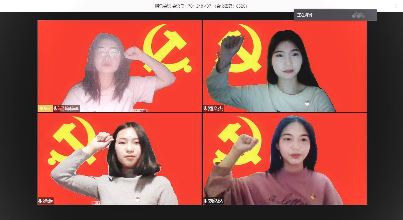 注:1,线上视频活动,主持人屏幕与其他学生屏幕相反。2,宣誓时,学生正对党旗,为主持人共享党旗屏幕截图。