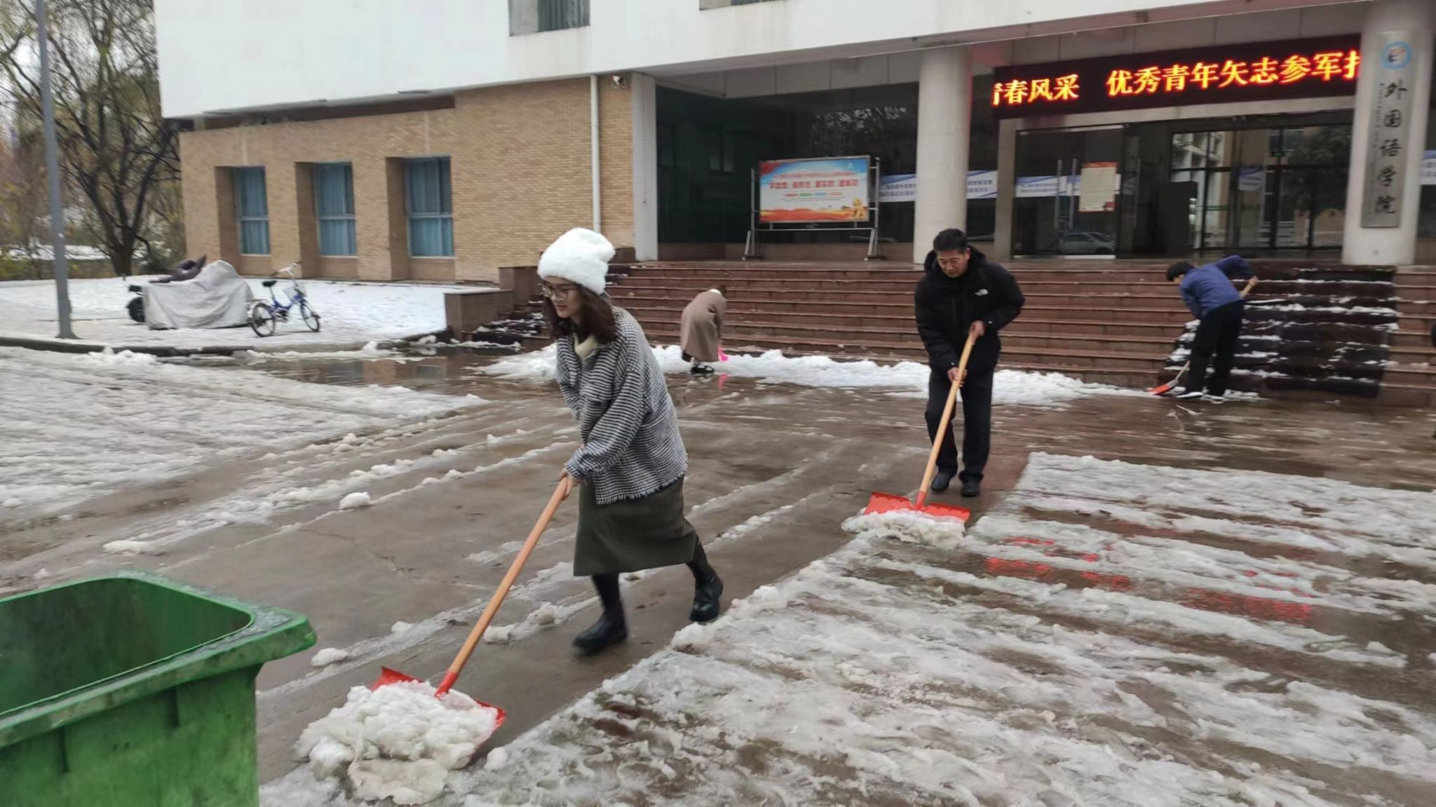 12月14日,洛阳迎来大雪寒潮极端天气,为确保广大师生在校园生活便捷、出行安全,校党委向全校党员发出“以雪为令 党员先行”——清冰除雪保安全倡议书。各级党组织闻令而动,广大师生纷纷投身除雪活动。