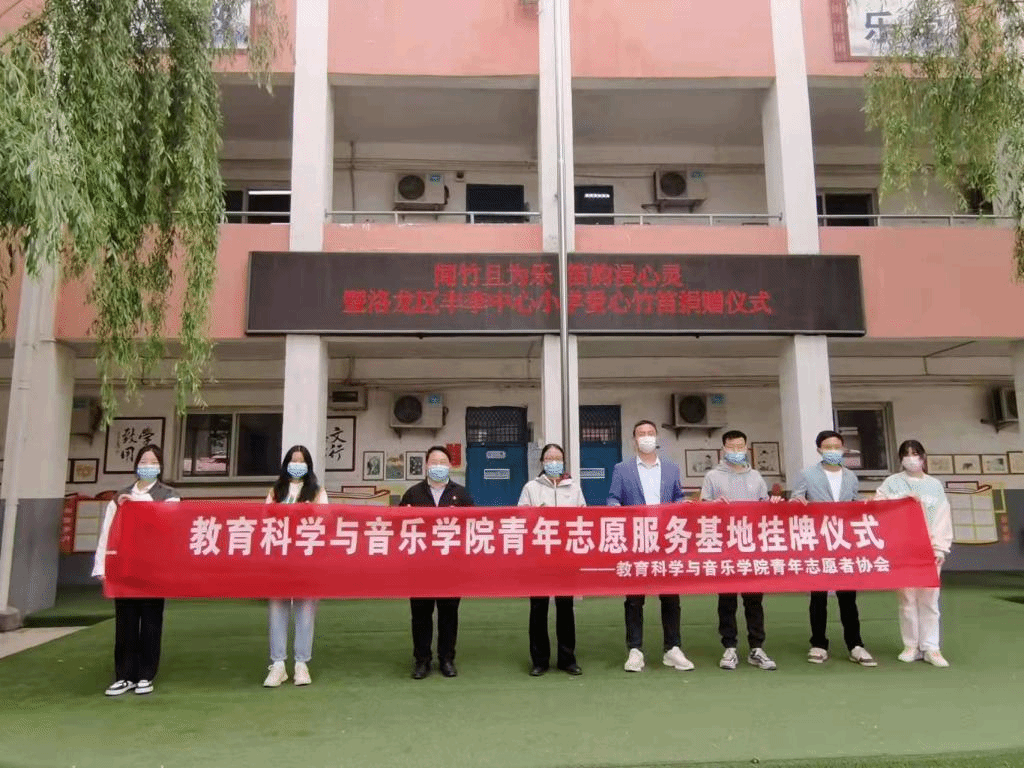 4月29日,教育科学与音乐美高梅娱乐场 协同美高梅娱乐场 优秀毕业生、河南彩韵演艺有限公司经理胡魁、洛阳市竹笛协会等一行来到了洛龙区丰李中心小学,向该校捐赠竹笛及教具130套,价值两万余元,并签约建立青年志愿者服务基地。美高梅娱乐场 党委副书记王敏,团委副书记郭圣龙参加本次活动。