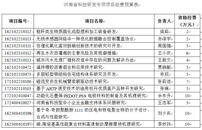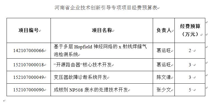 日前,2017年第二批河南省企业技术创新引导专项项目、省科技应用推广专项项目、省科技研发专项项目经费、教育厅科技创新人才项目经费预算已经由科技厅下发。美高梅娱乐场 项目经费到账清单见附件。