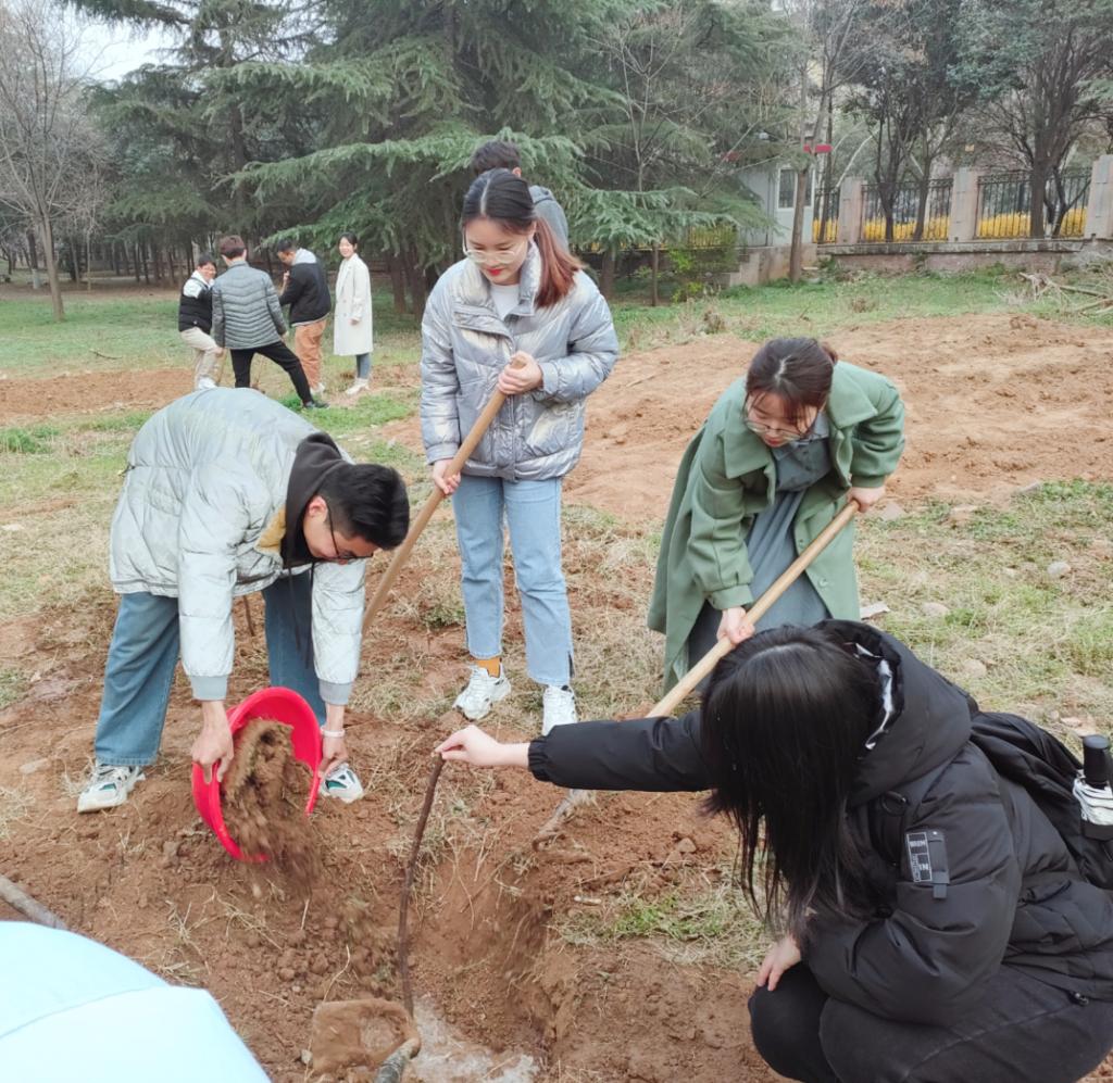 现场呈现出一幅热火朝天的植树劳动图,大家脸上也都洋溢着劳动的喜悦,用实际行动为校园增添了一片生机勃勃的绿色。植树完成后,支部成员们为纪念本次活动、寄予美好祝愿,为新种植的无花果树取了时尚新颖的名字——“坚强”、“卷王”、“未来”、“三月”,为保障树苗茁壮成长,安排了值班同学定期为其浇水管护。