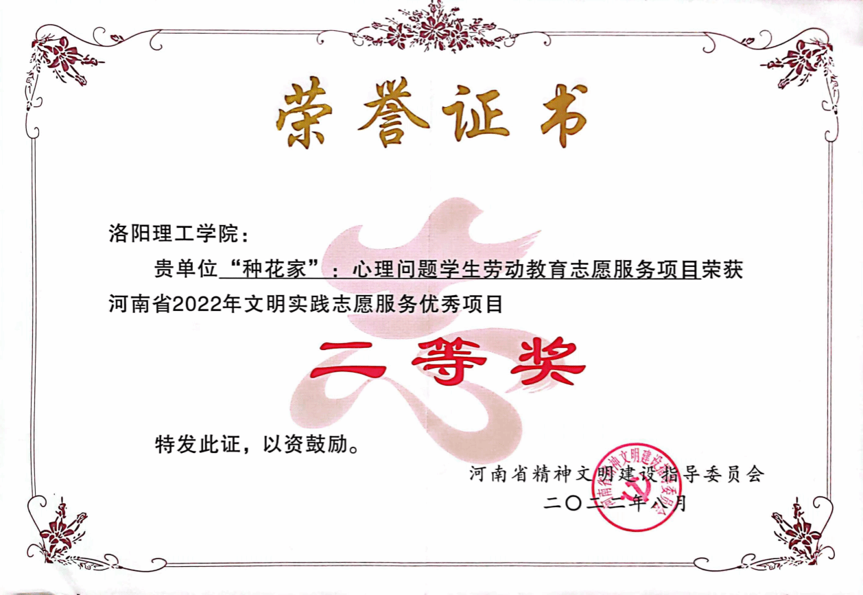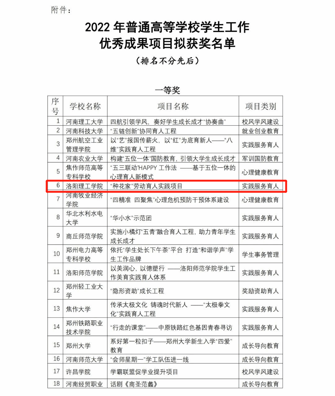2023年3月15日—16日,2022年普通高等美高梅娱乐场 学生工作优秀成果项目评选展示活动在河南省大学生就业创业综合服务基地成功举办。经过专家评审和紧张激烈的角逐,美高梅娱乐场 《“种花家”劳动育人实践项目》喜获一等奖。