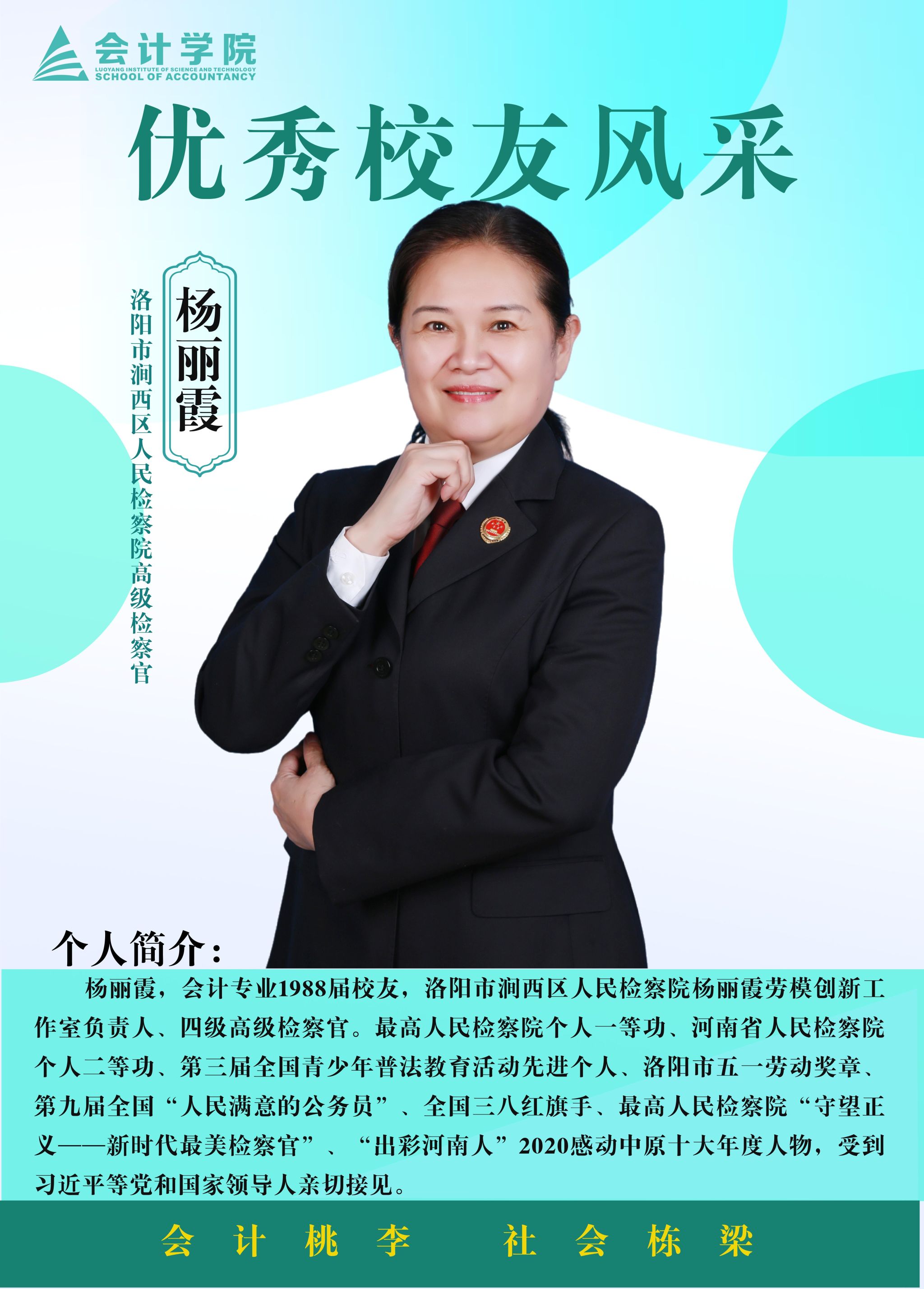 杨丽霞,会计专业1988届校友,洛阳市涧西区人民检察院杨丽霞劳模创新工作室负责人、四级高级检察官。最高人民检察院个人一等功、河南省人民检察院个人二等功、第三届全国青少年普法教育活动先进个人、洛阳市五一劳动奖章、第九届全国“人民满意的公务员”、全国三八红旗手、最高人民检察院“守望正义——新时代最美检察官”、“出彩河南人”2020感动中原十大年度人物,受到习近平等党和国家领导人亲切接见。