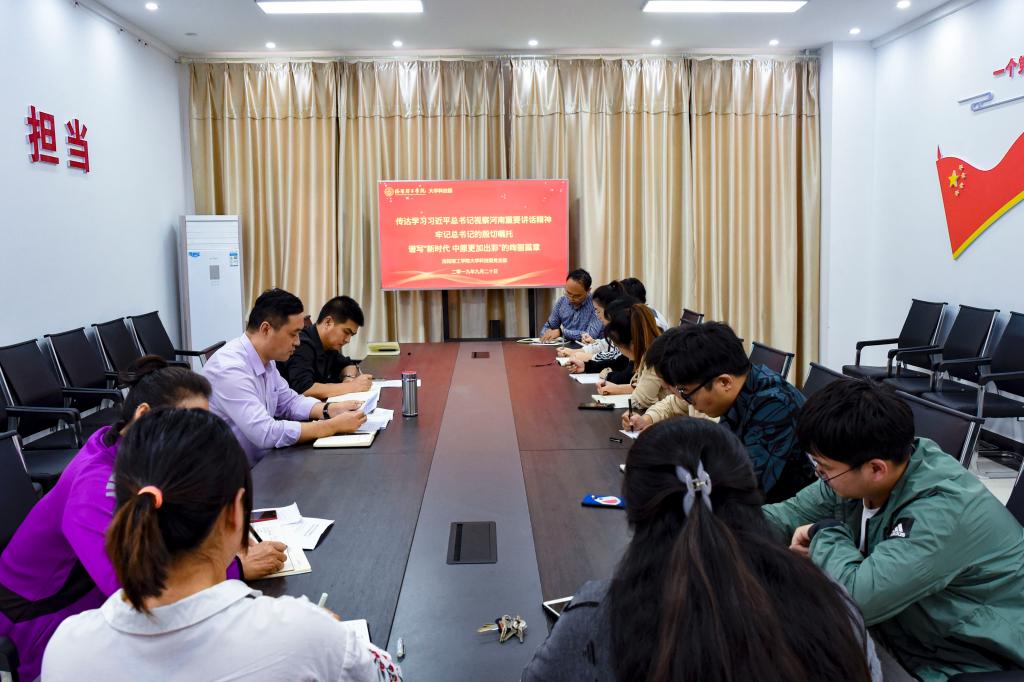 会议全文传达学习了习近平总书记视察河南重要讲话、在黄河流域生态保护和高质量发展座谈会上重要讲话精神。号召科技园全体员工深入学习、认真领会习近平总书记在河南考察调研时的重要指示,要坚持以习近平新时代中国特色社会主义思想为指导,不断增强“四个意识”、坚定“四个自信”、做到“两个维护”,认真学习贯彻习近平总书记重要讲话精神,坚守初心、勇担使命,坚定信心、锐意进取,以优异成绩庆祝新中国成立70周年。坚定信念,铭记党史、新中国史,自觉接受红色传统教育,牢记习近平总书记嘱托,不能忘记红色政权是怎么来的、新中国是怎么来的、今天的幸福生活是怎么来的。进一步加强政治理论学习,传承红色基因,发扬革命精神和斗争精神,深刻认识中国共产党人“为中国人民谋幸福、为中华民族谋复兴”的初心和使命,始终坚守、矢志不渝,自觉对标党和人民的崇高事业、对标共产党人的高尚情操,对标出彩河南建设的需要,对标大学科技园目标任务,不断增强守初心、担使命的思想自觉和行动自觉。