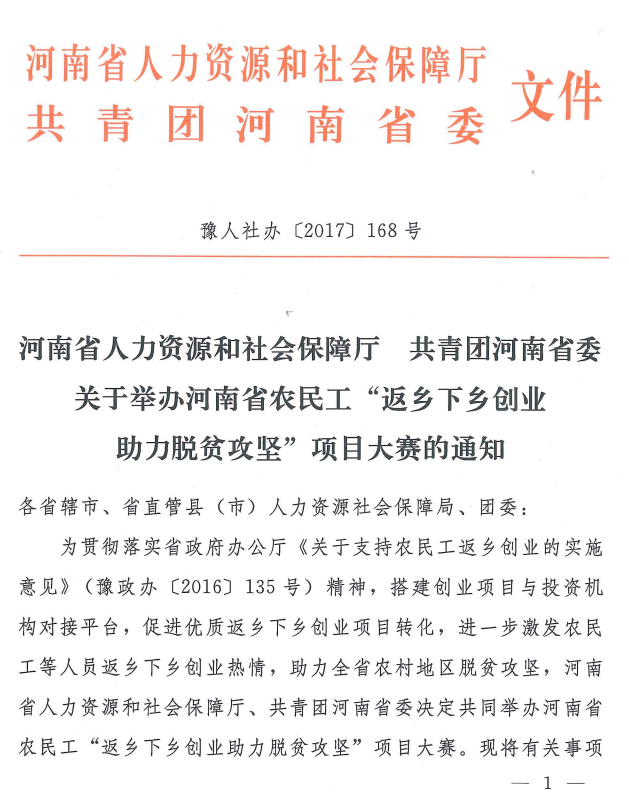 河南省农民工“返乡下乡创业助力脱贫攻坚”项目大赛的通知