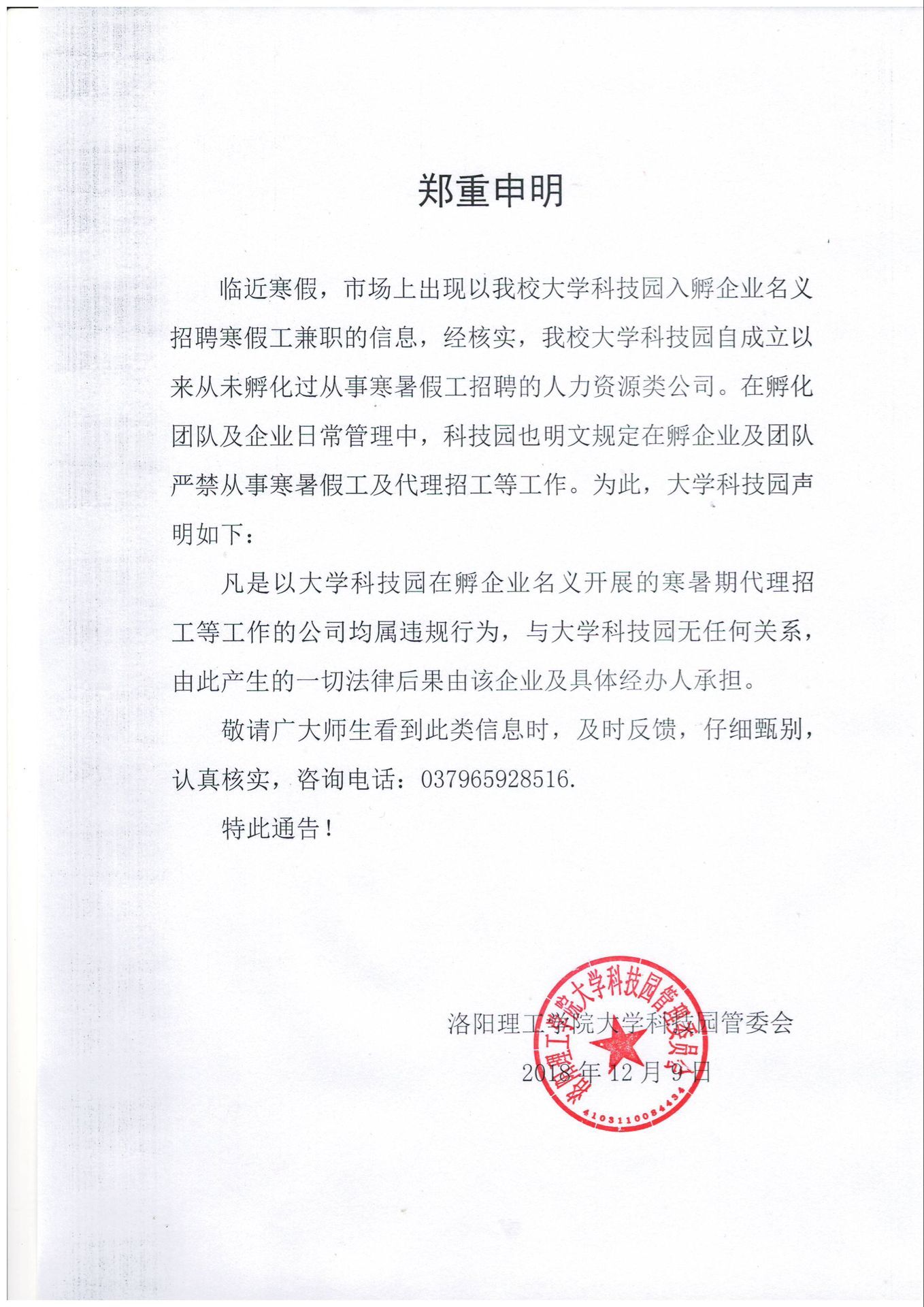 大学科技园自成立以来从未孵化过从事寒暑假工招聘的人力资源类公司。在孵化团队及企业日常管理中,科技园也明文规定在孵企业及团队严禁从事寒暑假工及代理招工等工作。为此,大学科技园声明如下: