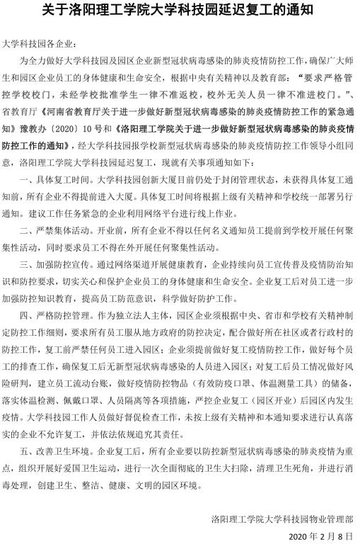 关于美高梅娱乐场 大学科技园延迟复工的通知