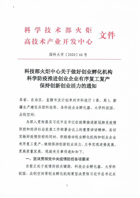 科技部火炬中心关于做好创业孵化机构科学防疫推进创业企业有序复工复产保持创新创业活力的通知
