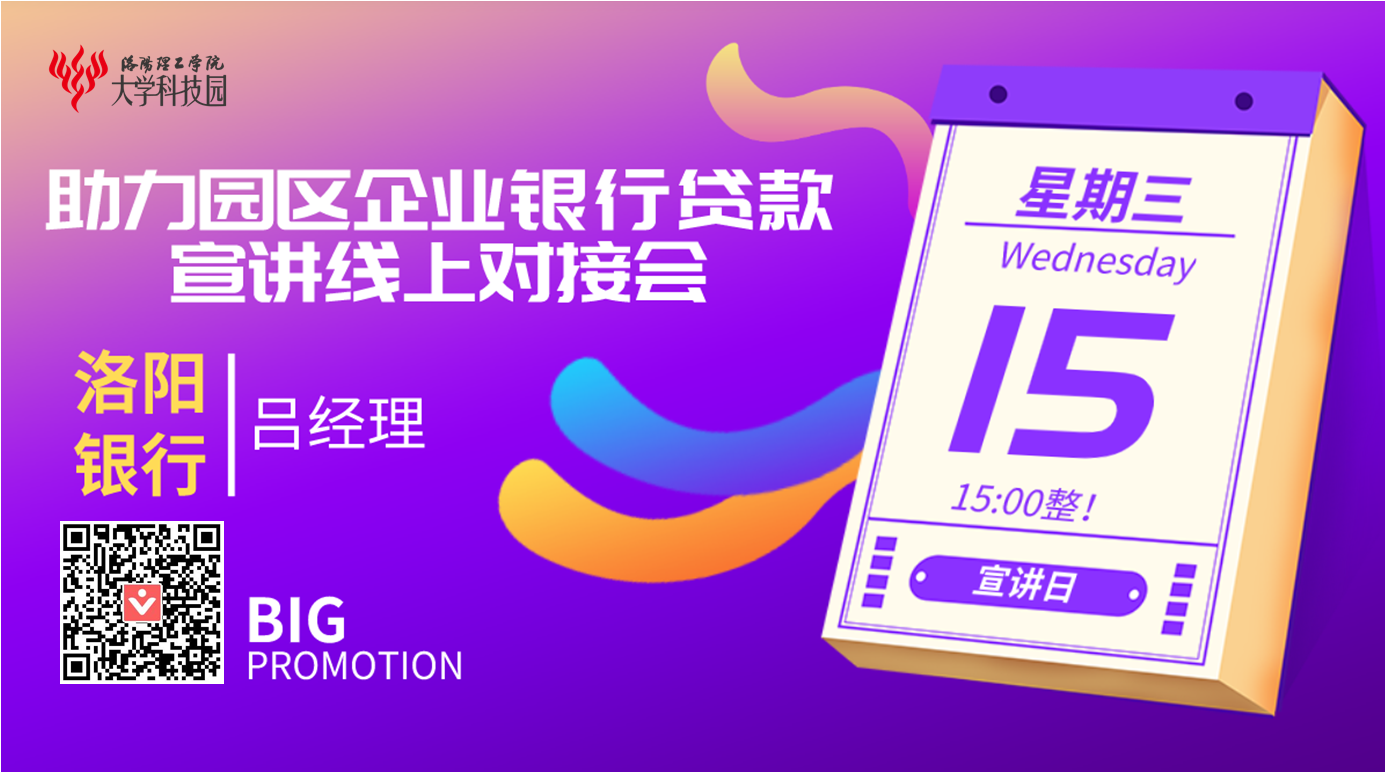 为大力支持园区企业有序复工复产,为企业提供资金支持。7月15日,大学科技园邀请洛阳银行举行“助力园区企业银行贷款宣讲”线上对接会。就洛阳银行优惠信贷产品进行线上宣讲,旨在通过银行小微企业信贷产品推介和普惠金融新政解读助力企业获得信贷,为企业提供资金支持。欢迎扫码参会。