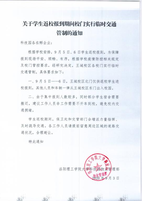 关于学生返校报到期间校门实行临时交通管制的通知