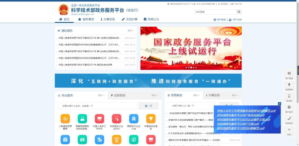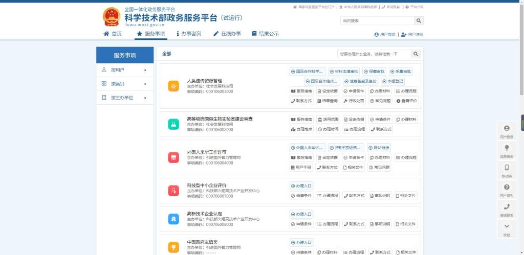 1、用户输入网址://fuwu.most.gov.cn/进入科学技术部政务服务平台,点击【用户登录】输入登录名、密码和验证码,点击【登录】按钮进行登录,如下图所示: