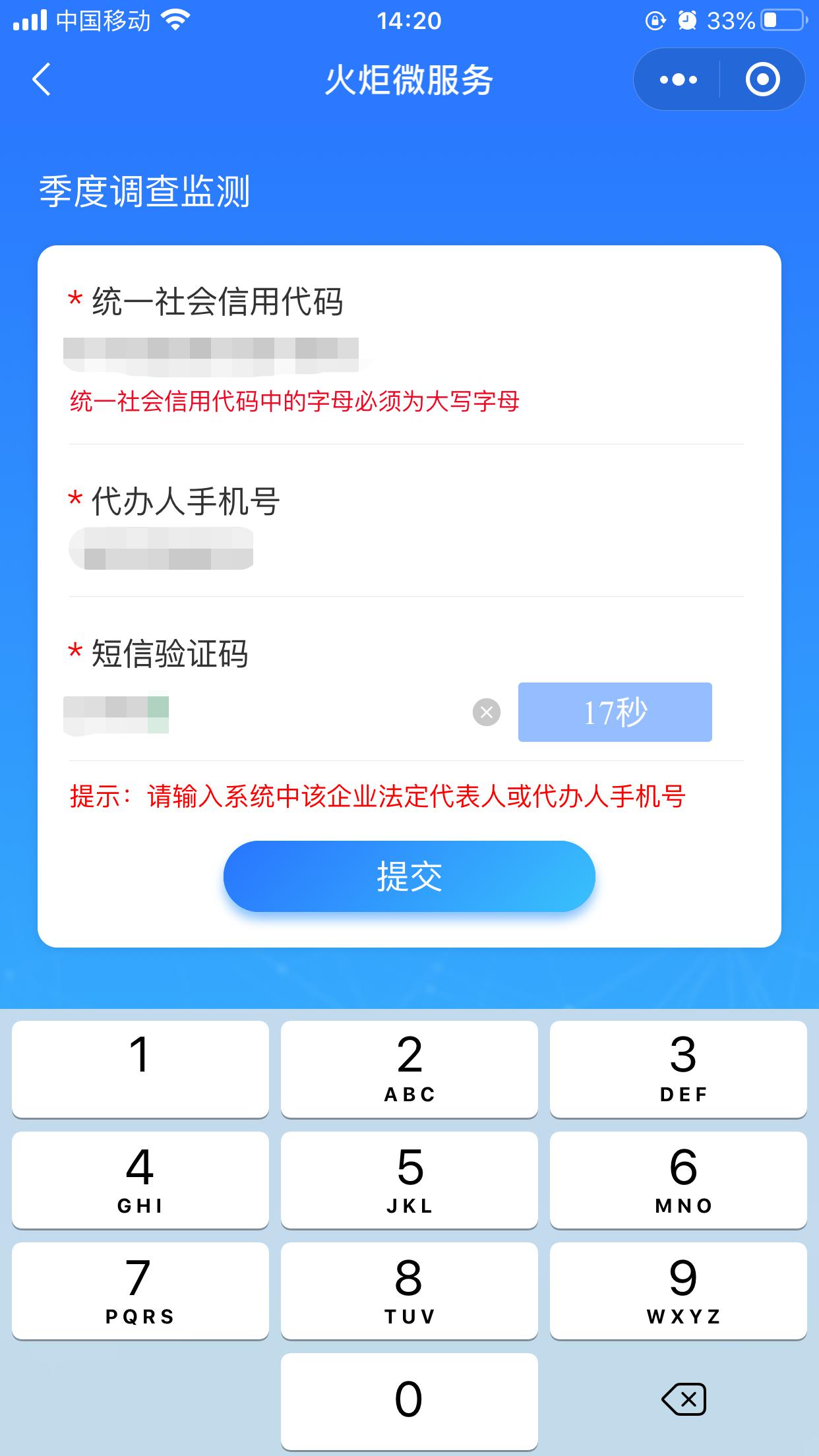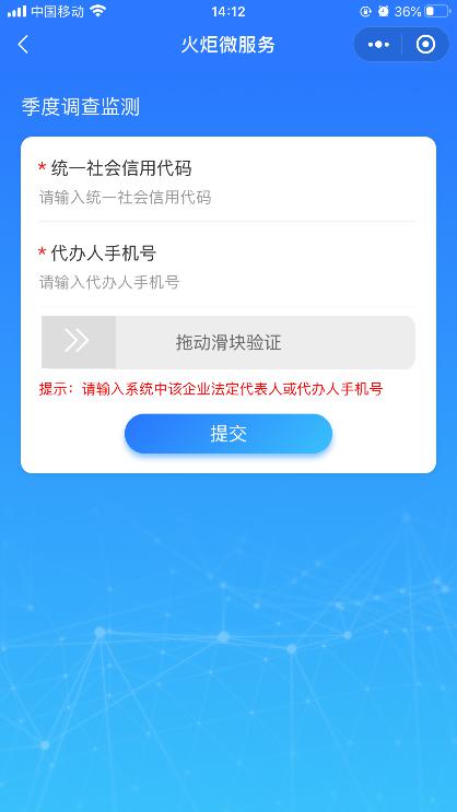 3、用户点击【季度调查监测】进入身份验证页面,输入统一社会信用代码和代办人手机号输入页面。如下图所示: