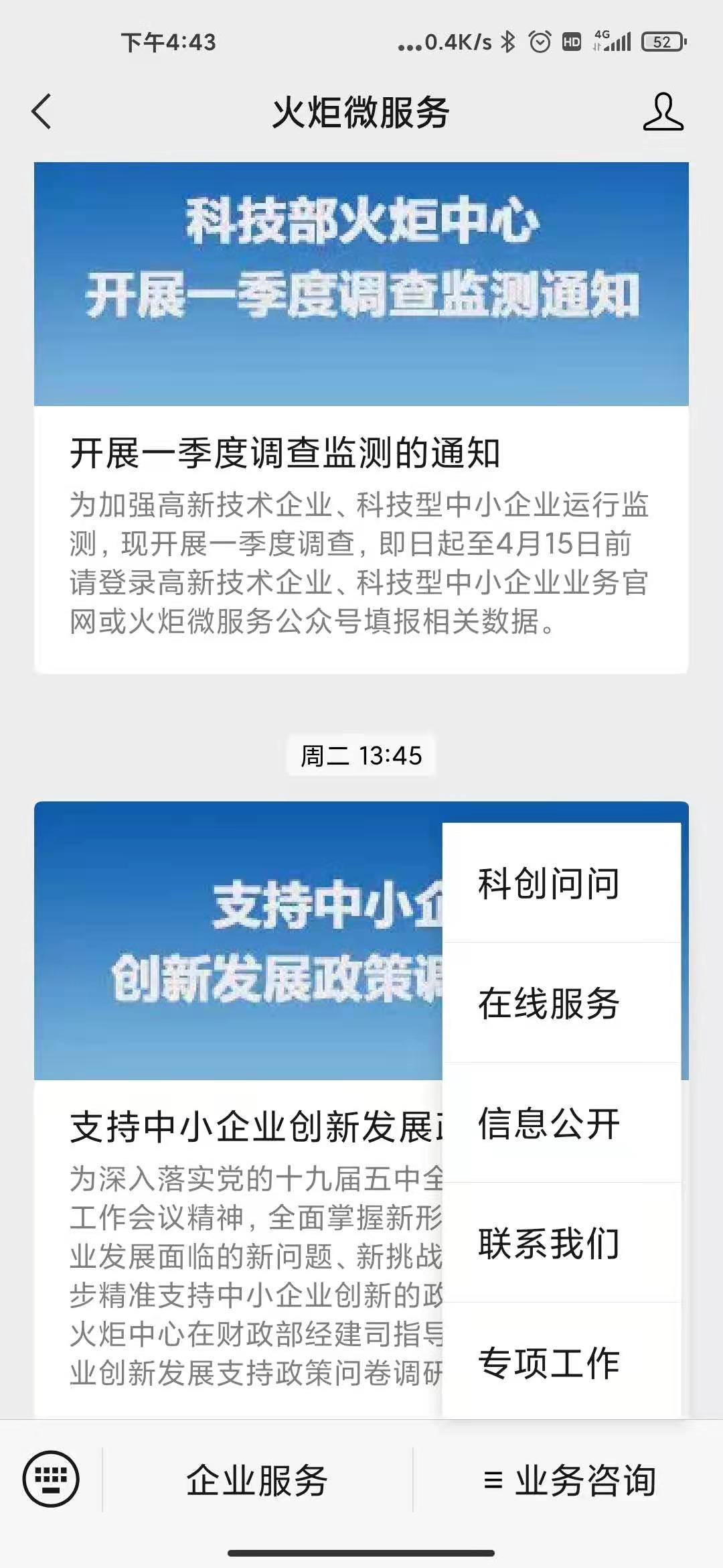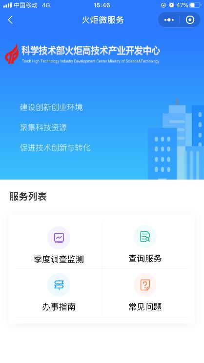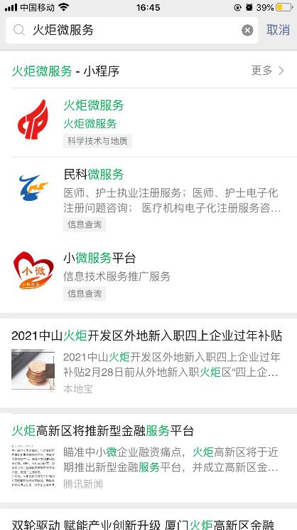 用户在手机微信中搜索关注【火炬微服务】公众号-企业服务或直接进入【火炬微服务】小程序,如下图所示: