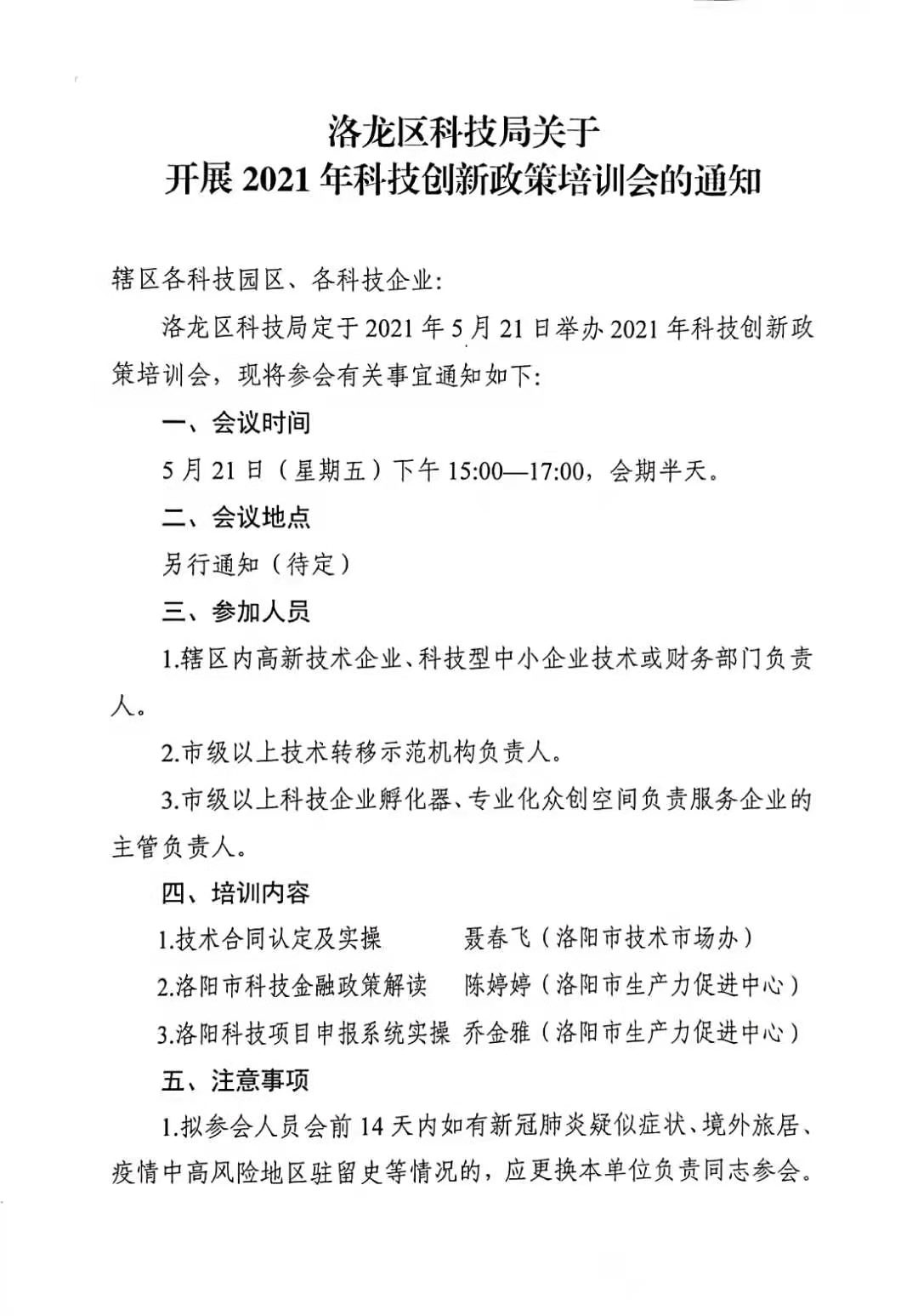 洛龙区科技局关于开展2021年科技创新政策培训会的通知
