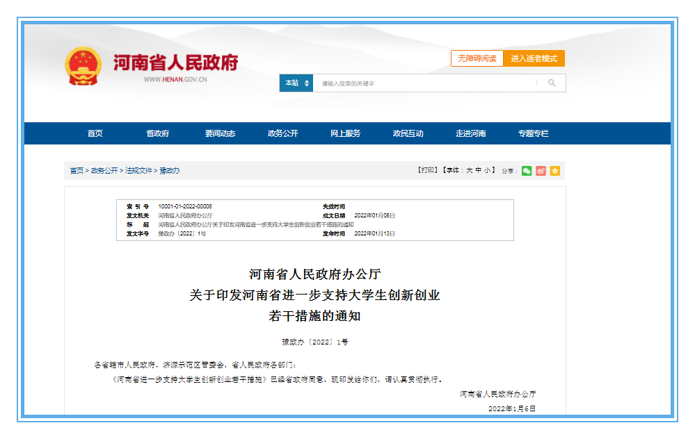 关于印发河南省进一步支持大学生创新创业若干措施的通知