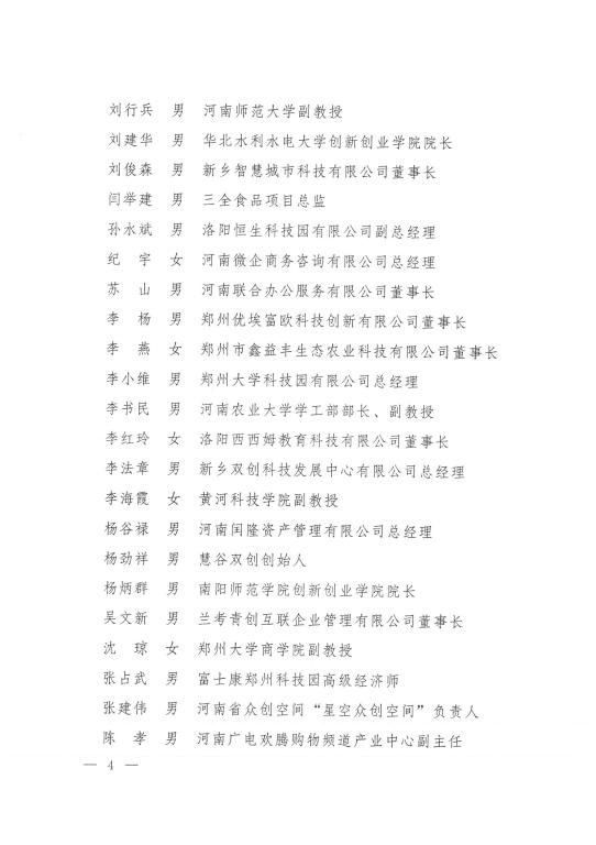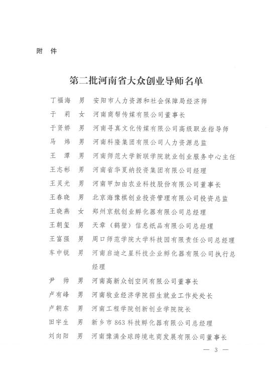 为深入推进大众创业万众创新,进一步提升我省创业服务工作水平,促进各项创业扶持政策贯彻落实,加强大众创业导师队伍建设,壮大河南省大众创业导师团,按照《河南省大众创业导师管理办法(试行)》规定的标准和程序,在各地择优推荐和个人自荐的基础上,经专家评审、省厅审核,确定聘任丁福海等60名同志为第二批河南省大众创业导师(按姓氏笔划排序,名单见附件),聘任期为三年。第二批河南省大众创业导师与第一批河南省大众创业导师共同组成“河南省大众创业导师团”。