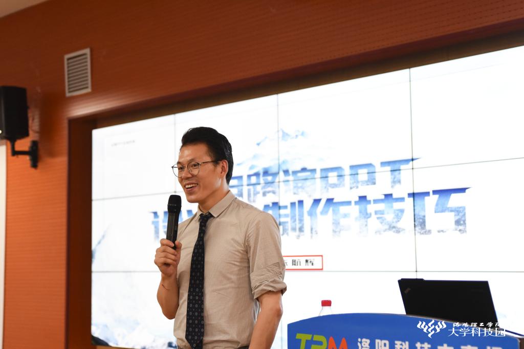 上午,洛阳大学科技园副总经理石超结合自身工作经验为同学们进行了一次极为详尽的商业计划书撰写课程;下午,洛阳幻想科技文化有限公司总经理张航辉为同学们讲解路演PPT制作技巧,据悉张航辉及其公司团队成员多次为洛阳市政府单位、创业团队制作路演PPT,有着丰富的工作经验。张航辉此次通过数个案例向同学们讲解PPT制作应使人产生共情并且简洁大方,课后仍有多名同学向授课老师请教问题。