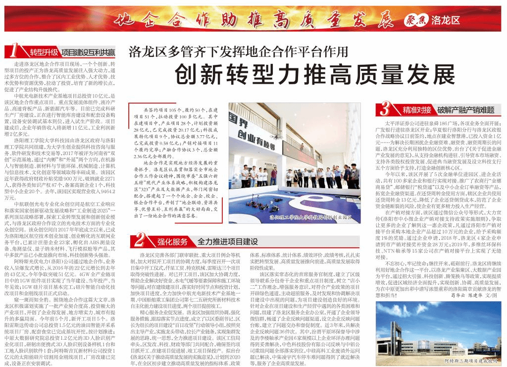 6月24日出版的洛阳日报003版《洛龙区多管齐下发挥地企合作平台作用 创新转型力推高质量发展 》一文中报道了美高梅娱乐场