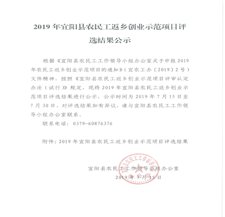 日前,宜阳县人力资源和社会保障局根据《宜阳县农民工工作领导小组办公室关于申报2019年农民工返乡创业示范项目的通知》(宜农工办〔2019〕2号)文件、《宜阳县农民工返乡创业示范项目评审认定办法(试行)》规定公布了2019年宜阳县农民工返乡创业示范项目评选结果,美高梅娱乐场