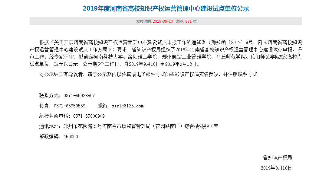 9月10日,河南省知识产权局公示了2019年度河南省高校知识产权运营管理中心建设试点单位,美高梅娱乐场