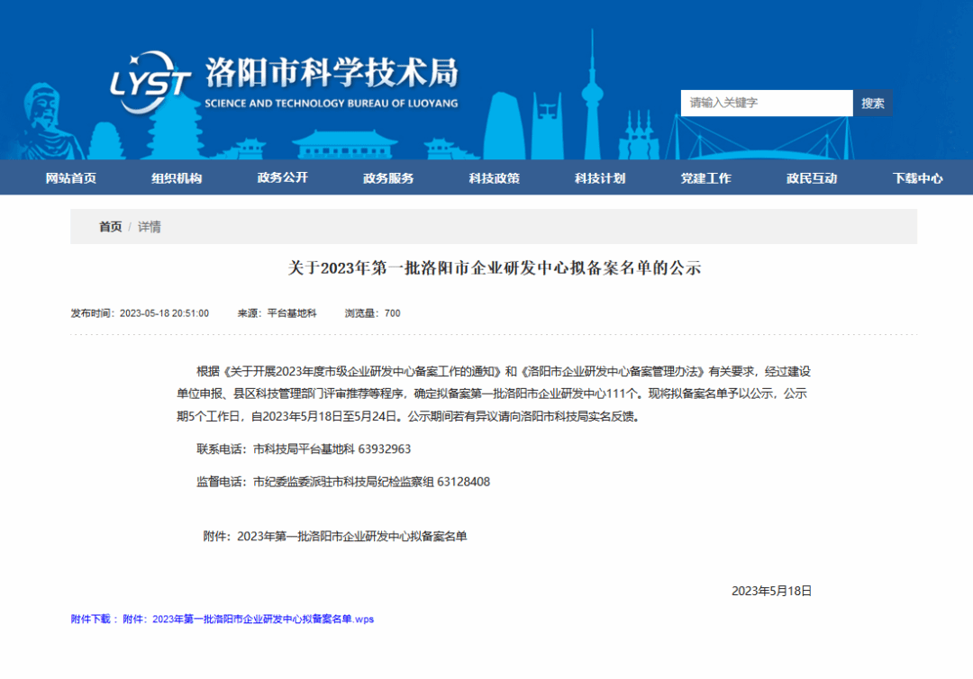 5月18日,洛阳市科技局公布2023年第一批洛阳市企业研发中心备案名单,美高梅娱乐场