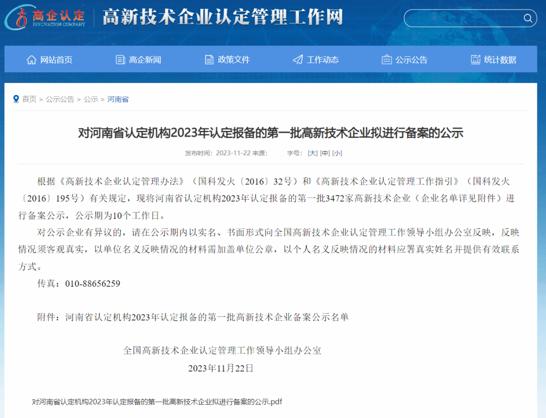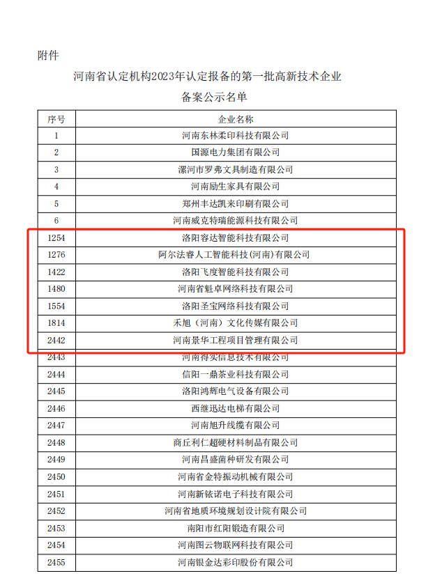 近日,全国高新技术企业认定管理工作领导小组办公室发布了《对河南省认定机构2023年认定报备的第一批高新技术企业拟进行备案的公示》,将河南省认定机构2023年认定报备的第一批3472家高新技术企业进行备案公示。园区洛阳容达智能科技有限公司、阿尔法睿人工智能科技(河南)有限公司等7家企业成功通过备案。