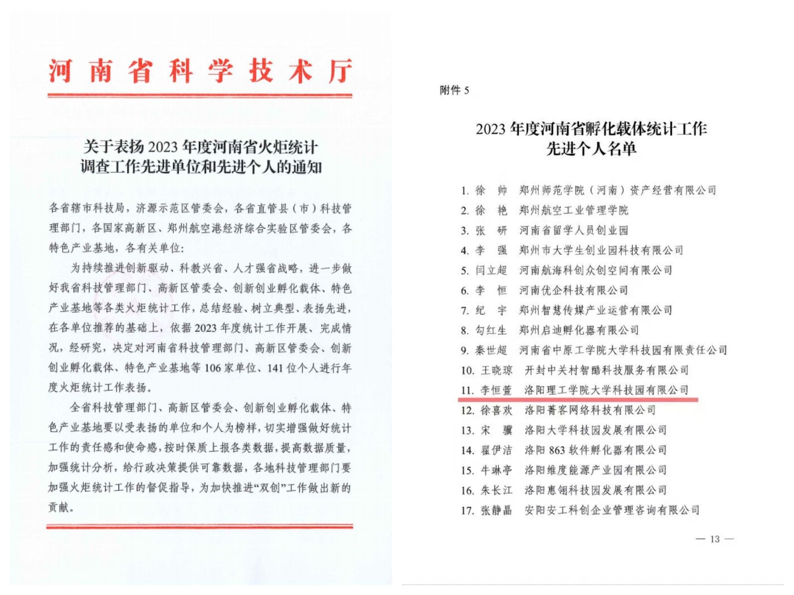 国家大学科技园创新发展部部长李恒萱荣获“河南省创新创业孵化载体统计工作先进个人”荣誉称号。