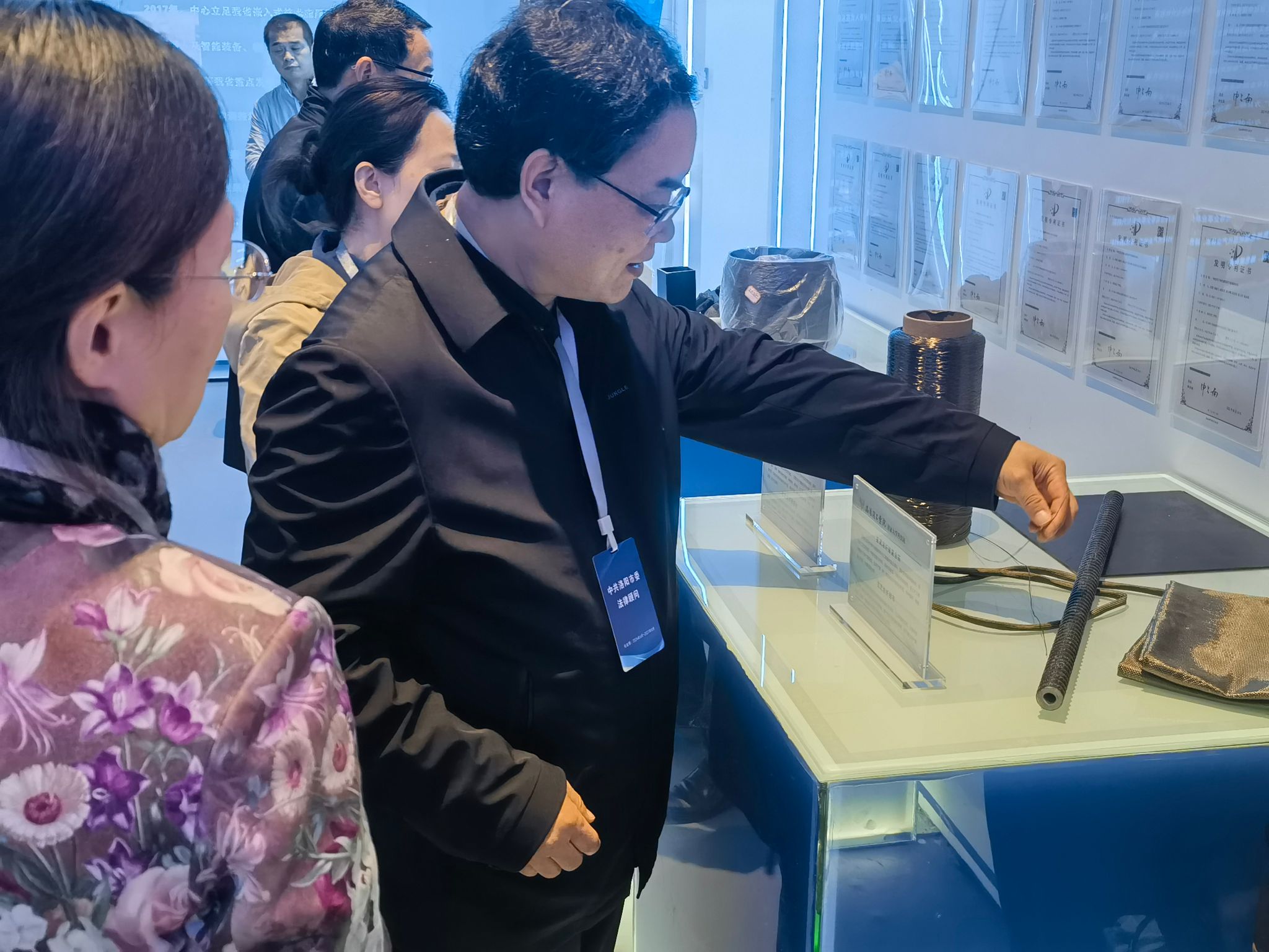 在一楼展厅,科技园负责人对考察团的到来表示欢迎,详细介绍了园区内企业在人工智能、大数据、云计算等领域的最新科研成果。调研团对科技园在推动科技创新、促进产业升级方面取得的成就表示赞赏,并就如何加强法治保障、优化营商环境等问题进行了深入交流。