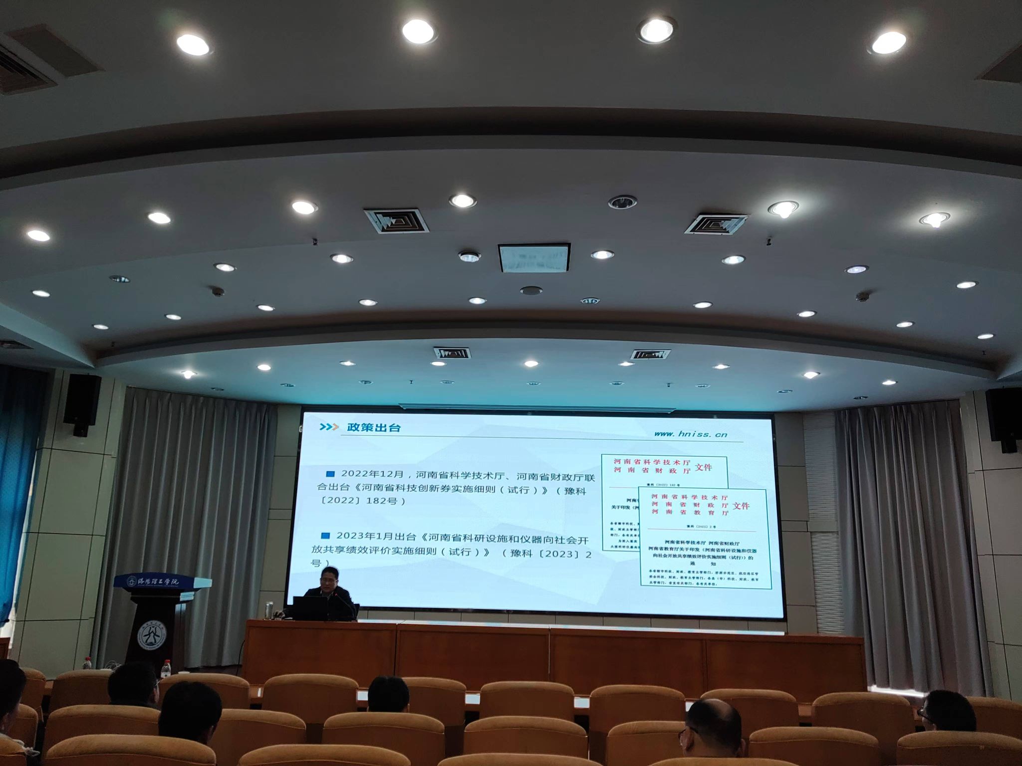 培训会特邀河南省科研设施与仪器共享服务平台主任刘朝科主讲。培训会上,刘朝科详细解读了《河南省科研设施和仪器向社会开放共享绩效评价实施细则》《河南省科技创新券实施细则》等政策,并围绕大型仪器设备开放共享与绩效评价、科技创新券的申领和使用等进行了讲解,与参会人员进行了深入探讨,对完善美高梅娱乐场