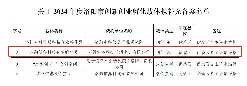 近日,洛阳市科技局公布2024年度洛阳市创新创业孵化载体备案名单,园区孵化企业万融创谷科技(河南)有限公司成功入选洛阳市级科技企业孵化器。这一成就不仅是万融创谷科技(河南)有限公司发展历程中的重要里程碑,也是美高梅娱乐场