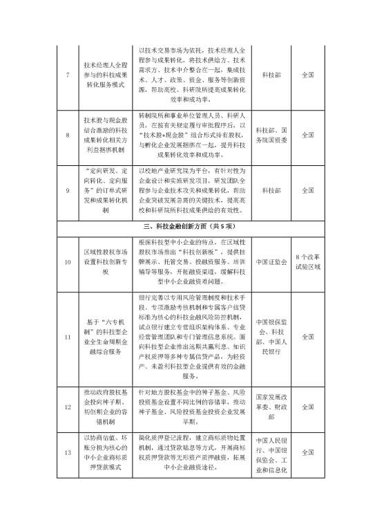 (三)科技金融创新方面5项:区域性股权市场设置科技创新专板;基于“六专机制”的科技型企业全生命周期金融综合服务;推动政府股权基金投向种子期、初创期企业的容错机制;以协商估值、坏账分担为核心的中小企业商标质押贷款模式;创新创业团队回购地方政府产业投资基金所持股权的机制。