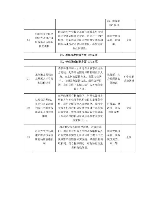 (五)管理体制创新方面3项:允许地方高校自主开展人才引进和职称评审;以授权为基础、市场化方式运营为核心的科研仪器设备开放共享机制;以地方立法形式建立推动改革创新的决策容错机制。