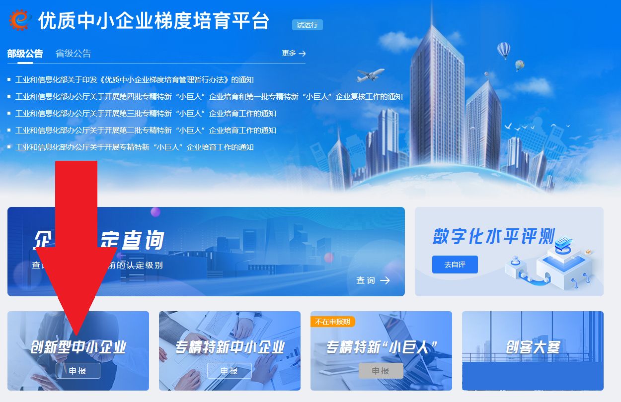 ↑ 第一步:注册账号,账号注册成功后,完善企业基本信息。需要回退一下,返回到↑美高梅娱乐场,点击“创新型中小企业”申报。