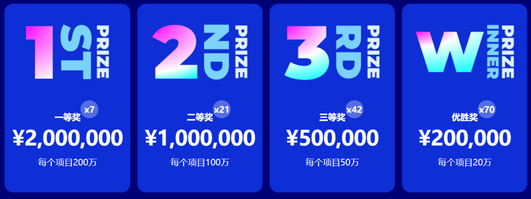 大赛共设置140个获奖名额,其中:一等奖7个,奖金200万元/项目;二等奖21个,奖金100万元/项目;三等奖42个,奖金50万元/项目;优胜奖70个,奖金20万元/项目。