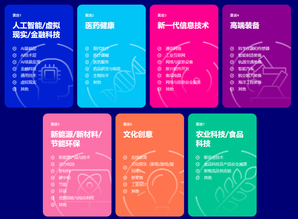 大赛按产业领域设置7个赛道,包括:人工智能/虚拟现实/金融科技赛道、新一代信息技术赛道、高端装备赛道、医药健康赛道、新能源/新材料/节能环保赛道、农业科技/食品科技赛道及文化创意赛道。
