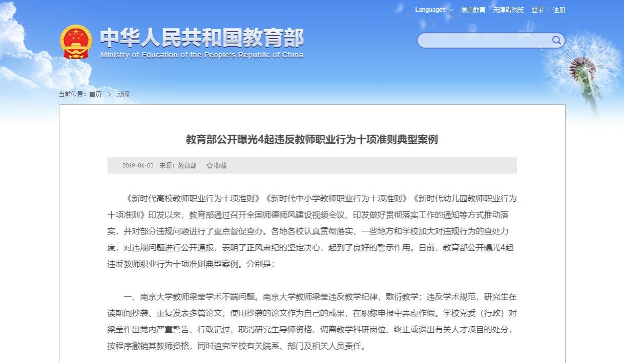 南京大学教师梁某违反教学纪律,敷衍教学;违反学术规范,研究生在读期间抄袭、重复发表多篇论文,使用抄袭的论文作为自己的成果,在职称申报中弄虚作假。美高梅娱乐场 党委(行政)对梁莹作出党内严重警告、行政记过、取消研究生导师资格、调离教学科研岗位、终止或退出有关人才项目的处分,按程序撤销其教师资格,同时追究美高梅娱乐场 有关院系、部门及相关人员责任。(来源:2019年4月,教育部公开曝光4起违反教师职业行为十项准则典型案例)