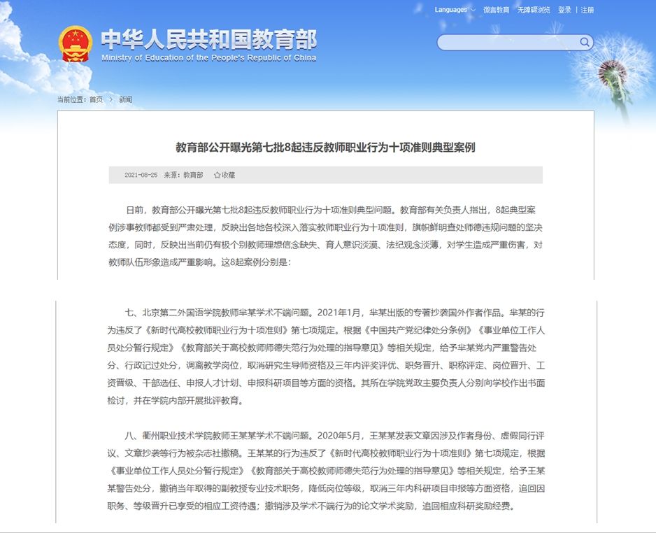 2021年1月,芈某出版的专著抄袭国外作者作品。芈某的行为违反了《新时代高校教师职业行为十项准则》第七项规定。根据《中国共产党纪律处分条例》《事业单位工作人员处分暂行规定》《教育部关于高校教师师德失范行为处理的指导意见》等相关规定,给予芈某党内严重警告处分、行政记过处分,调离教学岗位,取消研究生导师资格及三年内评奖评优、职务晋升、职称评定、岗位晋升、工资晋级、干部选任、申报人才计划、申报科研项目等方面的资格。其所在美高梅娱乐场 党政主要负责人分别向美高梅娱乐场 作出书面检讨,并在美高梅娱乐场 内部开展批评教育。(来源:2021年8月,教育部公开曝光第七批8起违反教师职业行为十项准则典型案例)