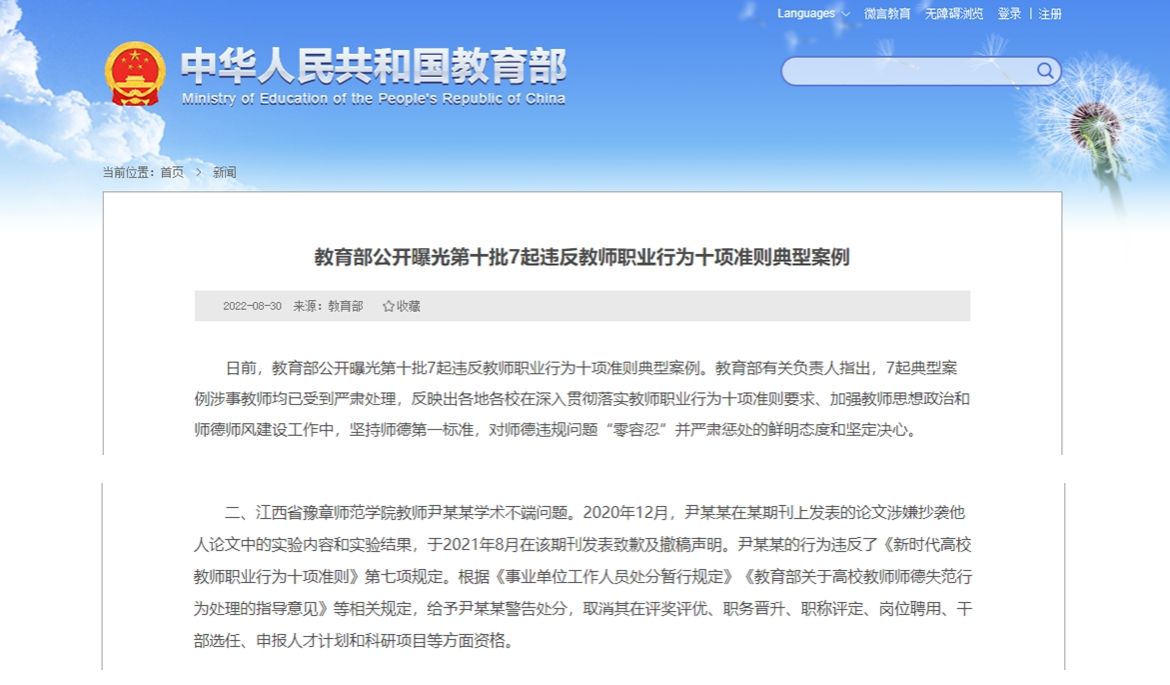 2020年12月,尹某某在某期刊上发表的论文涉嫌抄袭他人论文中的实验内容和实验结果,于2021年8月在该期刊发表致歉及撤稿声明。尹某某的行为违反了《新时代高校教师职业行为十项准则》第七项规定。根据《事业单位工作人员处分暂行规定》《教育部关于高校教师师德失范行为处理的指导意见》等相关规定,给予尹某某警告处分,取消其在评奖评优、职务晋升、职称评定、岗位聘用、干部选任、申报人才计划和科研项目等方面资格。(来源:2022年8月,教育部公开曝光第十批7起违反教师职业行为十项准则典型案例)