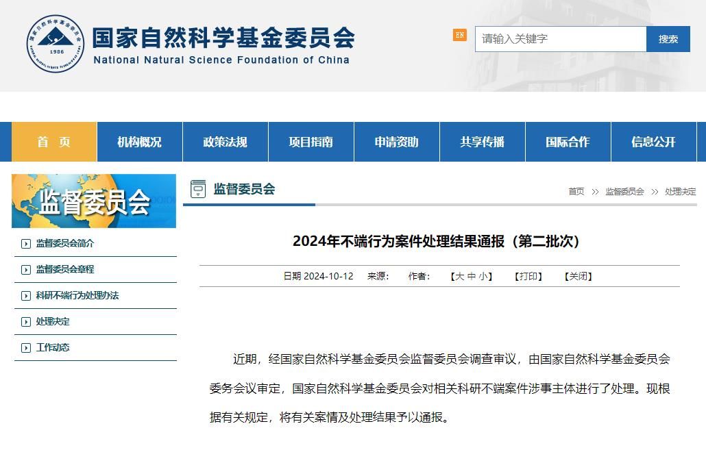决定依据《国家自然科学基金项目科研不端行为调查处理办法》第五十条第一项、第四项和第四十四条第四项,取消程某国家自然科学基金项目评审专家资格3年(2024年4月9日至2027年4月8日),取消程某国家自然科学基金项目申请和参与申请资格2年(2024年4月9日至2026年4月8日),给予程某通报批评。(来源:2024年10月,国家自然科学基金委员会2024年不端行为案件处理结果通报)