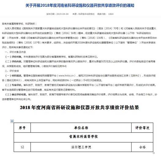 2019年4月,省科技厅、财政厅、教育厅组织开展2018年度河南省科研设施和仪器开放共享绩效评价工作。美高梅娱乐场 作为仪器共享单位,高度重视,根据通知要求,认真组织各院部开展工作。经单位申报、专家评价、现场核查、网上公示等程序,美高梅娱乐场 顺利通过绩效评价。据悉此次共有26家省属高校、32家省属科研院所参加绩效评价,其中11家单位评价等次为优秀,32家单位评价等次为合格,15家单位评价等次为不合格。